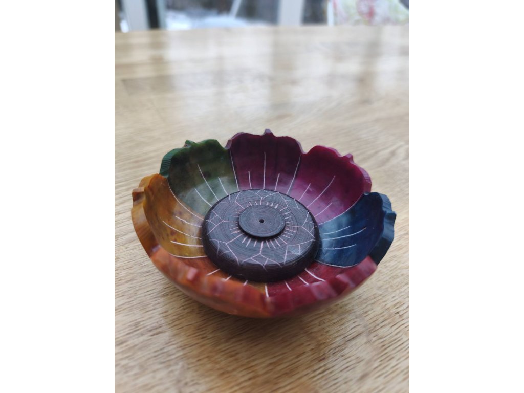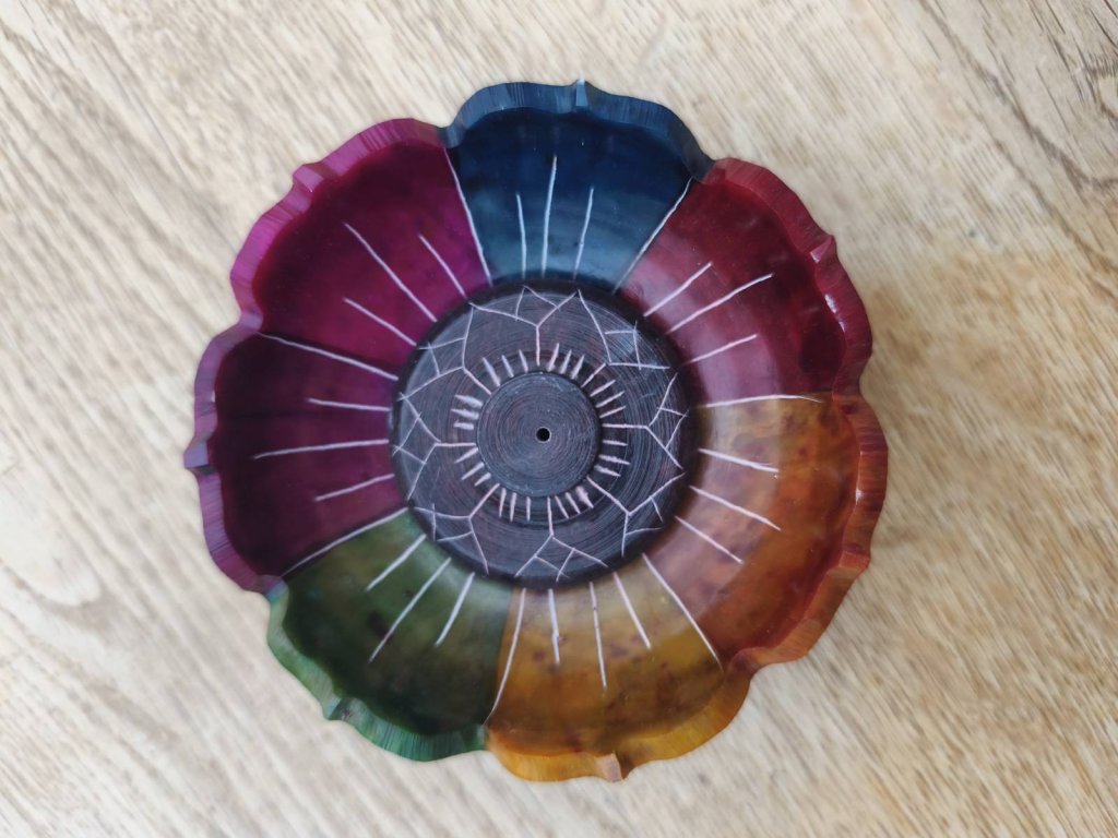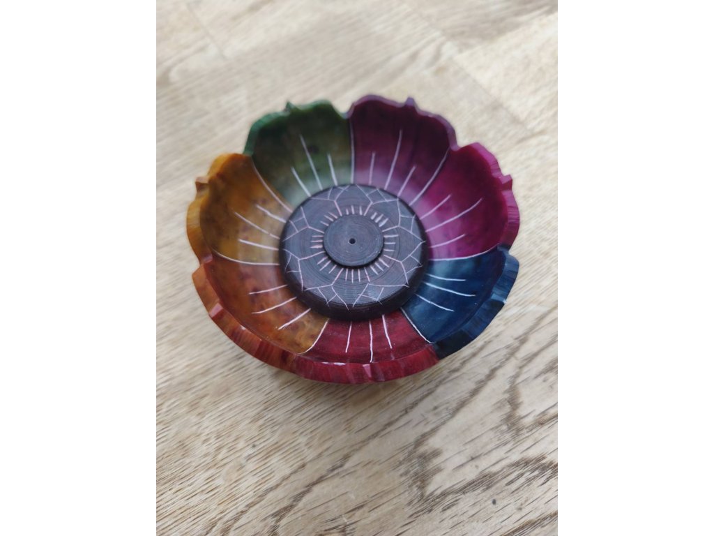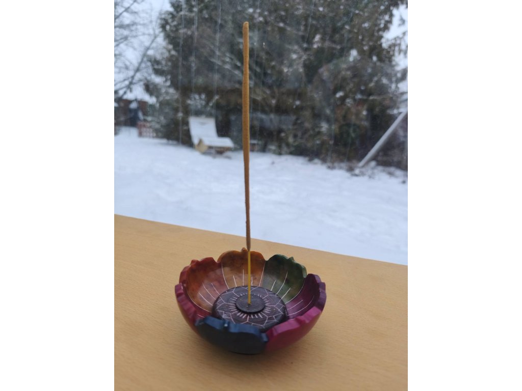 Stojánek na vonné tyčinky ve dvou designech. S vyrytou mandalou v duhových barvách, v plochém provedení a ve tvaru lotosu, opět v duhových barvách. V obou případech padá popílek s vonné tyčinky přímo pod sebe na stojánek. Jedná se o kameninu (mastek) kruhového tvaru o velikosti 7,5 cm